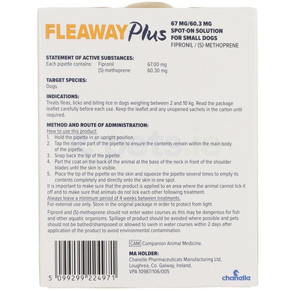 FleawayPlus Spot-on Solution is designed to treat fleas, ticks, and biting lice on small dogs weighing between 2 and 10kg. Keep the leaflet and any unopened sachets in the carton until required. Contains 1x 0.67ml of solution.